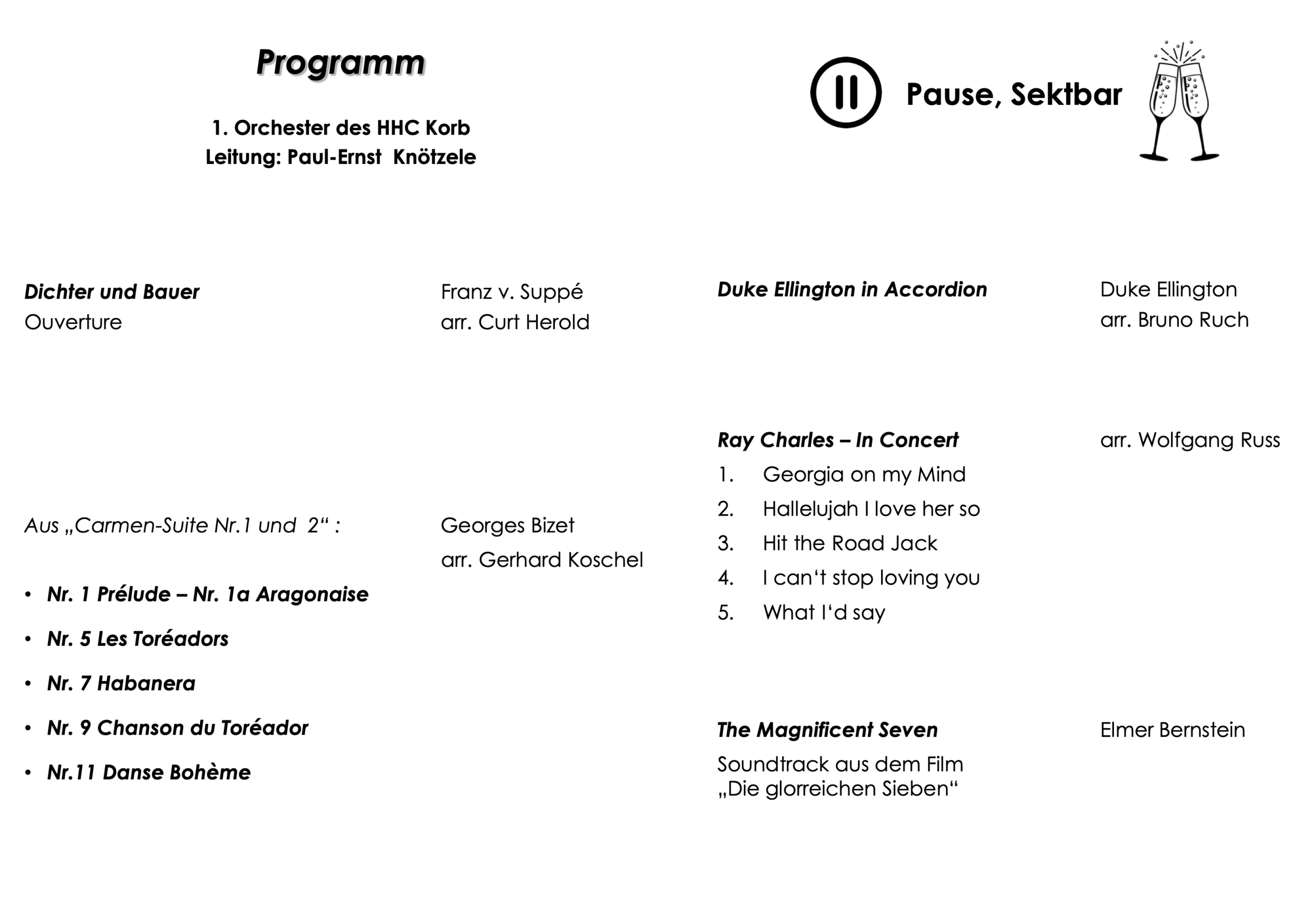 Nach der Begrüßung unseres musikalischen Vorstandes, Jürgen Weber, eröffnete das 1. Orchester unter Leitung von Paul-Ernst Knötzele mit der Ouvertüre zu Orpheus in der Unterwelt den musikalischen Reigen. Danach folgte das Sandpaper-Ballett sowie The Typewriter, beide von Leroy Anderson. Hier gaben Schlagzeuger Hartmut und Schreibmaschinensolist Tobias den Ton an. Danach folgte die Komposition von H-G. Kölz Return to Värmeland unter Verwendung des schwedischen Volksliedes Ack Värmeland, du sköna. Den Abschluss des ersten Teils der Matinee bildete ein Potpourri zu West Side Story von L. Bernstein. Nach lange anhaltendem Applaus wurde dann der Blue Tango als Zugabe vorgetragen.